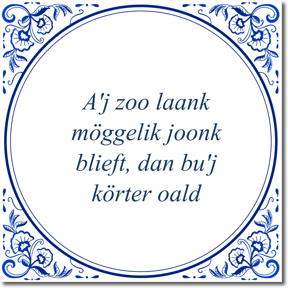 Een tegeltje is tijdloos, hip, leuk en altijd welkom. Tegeltjeswijsheid werkt voor iedereen. De tekst: “A’j zoo laank möggelik joonk blieft, dan bu’j körter oald” maak het een origineel cadeau. Je kunt echt elke vriend of elk familielid of elke kennis, blij maken met leuke wandtegeltjes. Tegeltjes zijn er met leuke teksten, spreuken, gezegdes, er is van alles mogelijk. Het is een blijvend cadeau en staat of hangt mooi aan iedere muur.