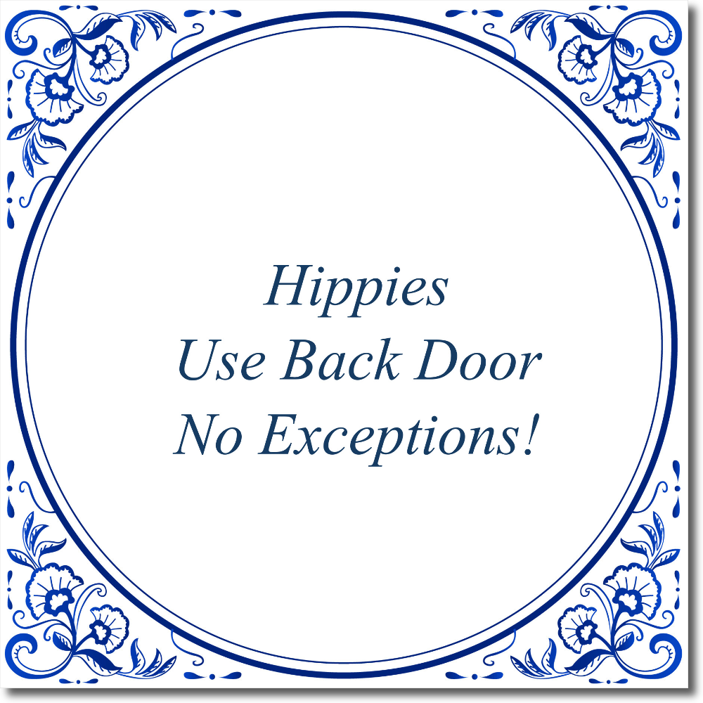 Een tegeltje is tijdloos, hip, leuk en altijd welkom. Tegeltjeswijsheid werkt voor iedereen. De tekst: “Hippies Use Back Door No Exceptions!” maak het een origineel cadeau. Je kunt echt elke vriend of elk familielid of elke kennis, blij maken met leuke wandtegeltjes. Tegeltjes zijn er met leuke teksten, spreuken, gezegdes, er is van alles mogelijk. Het is een blijvend cadeau en staat of hangt mooi aan iedere muur.