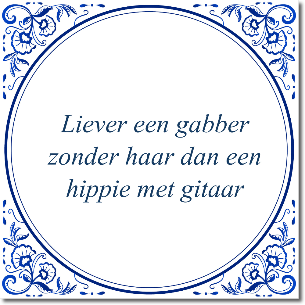 Een tegeltje is tijdloos, hip, leuk en altijd welkom. Tegeltjeswijsheid werkt voor iedereen. De tekst: “Liever een gabber zonder haar dan een hippie met gitaar” maak het een origineel cadeau. Je kunt echt elke vriend of elk familielid of elke kennis, blij maken met leuke wandtegeltjes. Tegeltjes zijn er met leuke teksten, spreuken, gezegdes, er is van alles mogelijk. Het is een blijvend cadeau en staat of hangt mooi aan iedere muur.