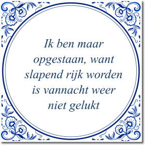Een tegeltje is tijdloos, hip, leuk en altijd welkom. Tegeltjeswijsheid werkt voor iedereen. De tekst: “Water doet de palen rotten, die het drinken zijn de zotten” maak het een origineel cadeau. Je kunt echt elke vriend of elk familielid of elke kennis, blij maken met leuke wandtegeltjes. Tegeltjes zijn er met leuke teksten, spreuken, gezegdes, er is van alles mogelijk. Het is een blijvend cadeau en staat of hangt mooi aan iedere muur.